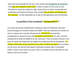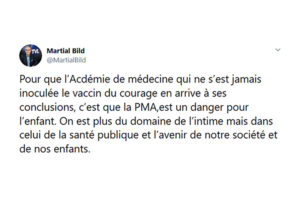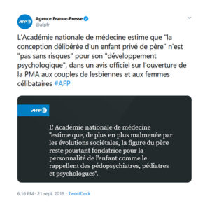 Exemple avec cet avis de l’Académie natio­nale de méde­cine quant au débat sur la loi Bioé­thique et notam­ment à la PMA dite « pour tou.t.e.s ».